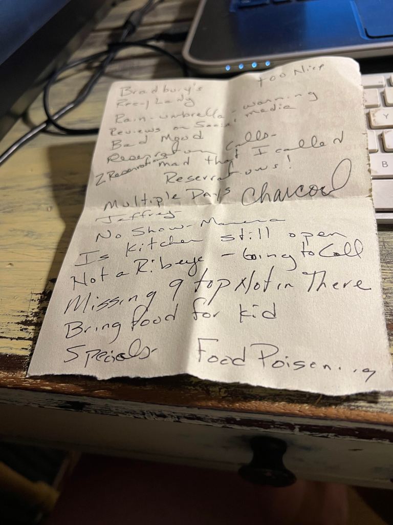 Around 7:50 I noticed a reservation on table 25 had disappeared.  I go looking….did they move outside, did I mark them as seated by mistake….