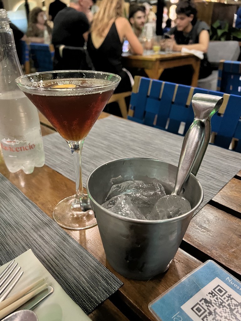 A delicious Manhattan. Accompanied by a tiny bucket of ice, which is always the case if you want ice for your drink.