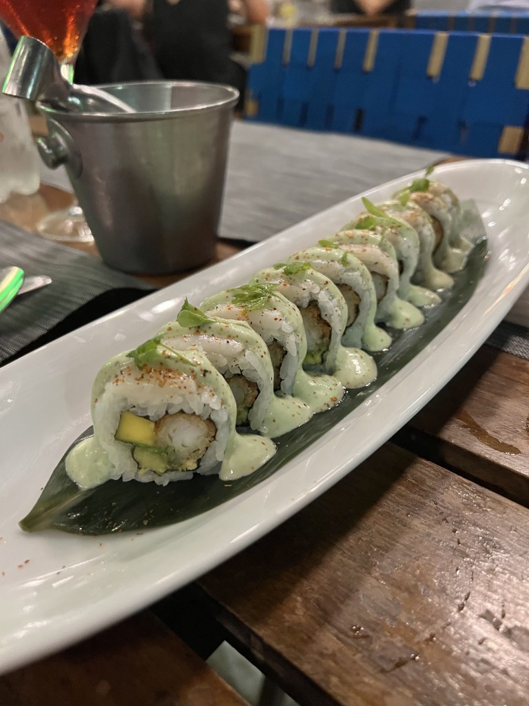 First, we get a sushi roll, with shrimp, avocado, and mango.