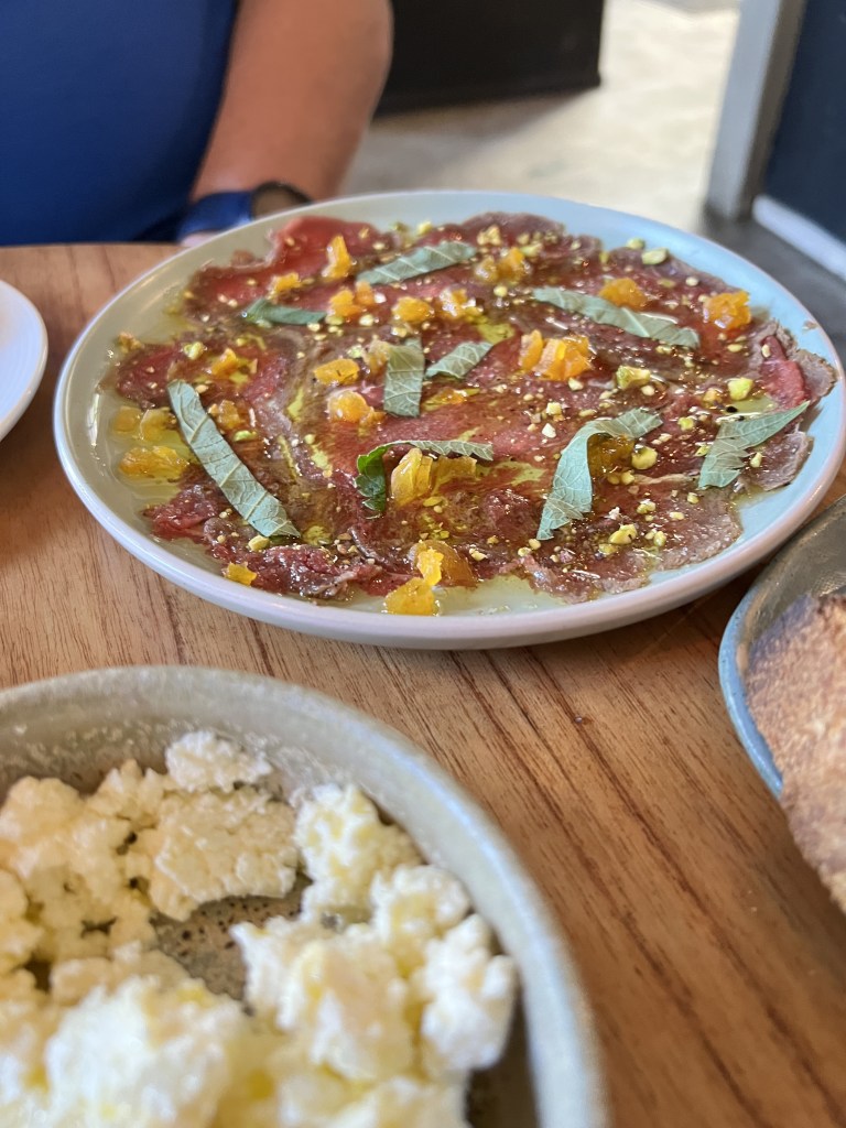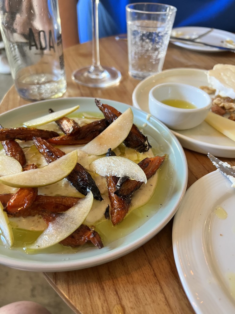 We were seated, and ordered a bottle of wine to share and an assortment of snacks. Some charcuterie, grilled carrots, venison tartar (which was delicious), and bread with cheese.