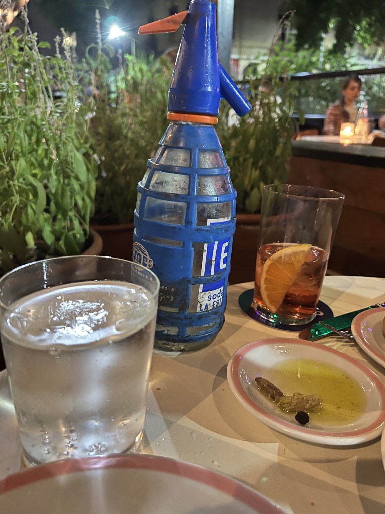 After about 15 minutes, Chef signals that we want to order drinks and we do. And they come. But no one has asked if we want water, still or con gas. I NEED WATER!!! – CON GAS!!!