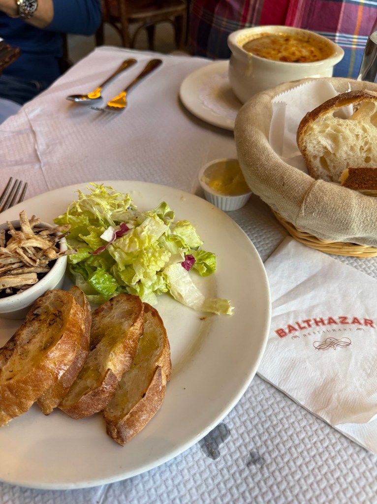We got our morning libations and headed south in a cab to SOHO to have lunch at Balthazar.  Balthazar is the restaurant Adam and I ever went to that wasn’t a diner in our neighborhood.  One that first trip, we got chicken liver mousse, and steak tartare.  Both are part of our restaurant favorites whenever we eat out.  We also have them at home occasionally when Adam is feeling adventurous when he cooks.  His version of both are great.