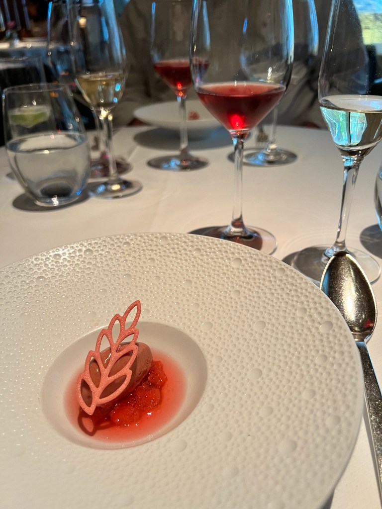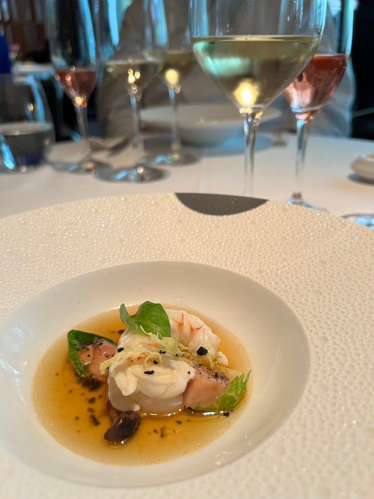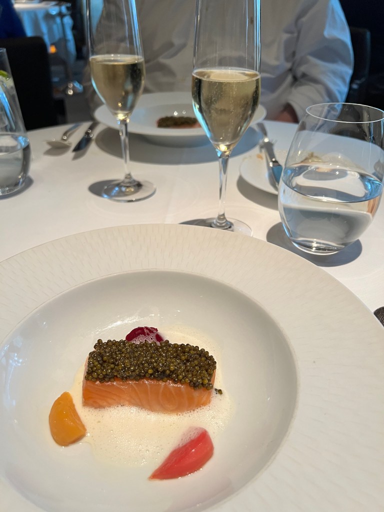 The bubbles were delivered promptly, we were asked if we were doing the tasting menu, or ala carte.  We chose the tasting menu, and looking around the dining room we were the only guests doing so.  We also chose the wine pairings as well.